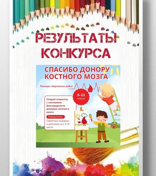 The main winners (by voting): 1st place — Darina Chigvintseva (5th grade, Secondary School No. 1 Tayynsha) — 319 votes 2nd place — Maria Dermanovskaya (4th "A" class, Secondary school No. 1 Tayynsha) — 243 votes 3rd place — Diana Krendeleva (5th "A" class, Secondary school No. 1 Tayynsha) — 227 votes The nomination "Creative drawing": — Malykhina Amelia, 6th grade, gymnasium "Best" — Jaqen Aydin, 9th grade, gymnasium "Best" All participants of the competition will receive diplomas and memorable gifts. The winners are invited to the Blood Center on September 24 at 14:00 for the solemn presentation of diplomas and gifts. On September 24, a guided tour of the Blood Center will be held for all participants! Thanks to all the guys for participating Your works are sincere words of gratitude to donors who give people hope and a chance at life.